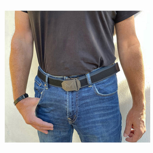 Cinturón lona, hebilla metálica, Negro/Azul Piedra, Montreal.